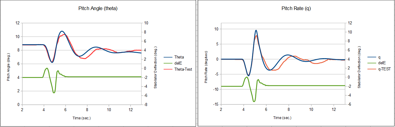 The flight test of interest to us included two maneuvers that are commonly used to evaluate the flight dynamics of an aircraft, a "stabilator doublet" and a "rudder doublet". The aircraft enters each maneuver trimmed and in straight and level flight. For the stabilator doublet, the pilot first pushes the stick forward, then pulls the stick back an approximately equal displacment, then allows the stick to return to its trim position. This perturbs the aircraft from level flight and stimulates both its short-period and phugoid responses. For the rudder doublet, the pilot pushes on one rudder pedal, then pushes on the other rudder pedal approximately the same displacement, then allows the rudder to return to center. This stimulates the aircraft's lateral/directional responses.