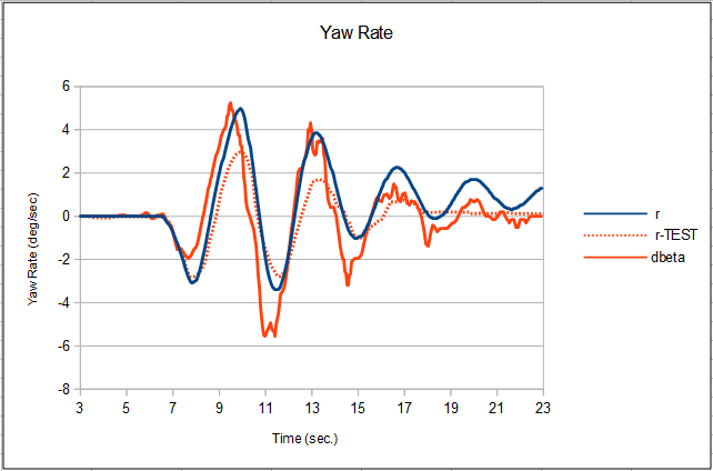 The roll rate plot shows the same excellent correlation as the roll angle plot. But the correlation of the yaw rate plot isn't nearly as good as that of the yaw angle plot. We ask, "Why the descrepancy in this one plot?" The figure to the left shows the same plot with a third curve. (Click to enlarge.) The measured yaw rate is now the dashed, red line. The solid red line is the numerically differentiated time-derivative of the measured sideslip angle. This value and the measured yaw rate curve should be close. They aren't. There seems to be a good deal of error beginning at about 7 seconds. From that point on, the measured yaw rate is simply wrong. But the derivative, on the other hand, shows reasonably good correlation with Multi-Sim's yaw rate prediction--what we would expect. We can conclude that something happened to the measured yaw rate data, either a sensor problem on the aircraft or a loss of fidelity due to the data being digitized from a copy of a copy. Multi-Sim's accuracy has allowed us to diagnose a problem with the data.